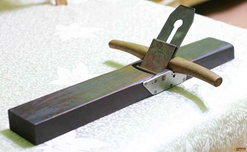 刮刀:一種薄細(xì)的刀片,用較軟的鋼材制成。平直的刮刀用于做平面,有弧度的可以刮有弧度的木件。使用時(shí)一般雙手握著,用大拇指抵住中間,與木面成一定斜度向前推(見(jiàn)下圖